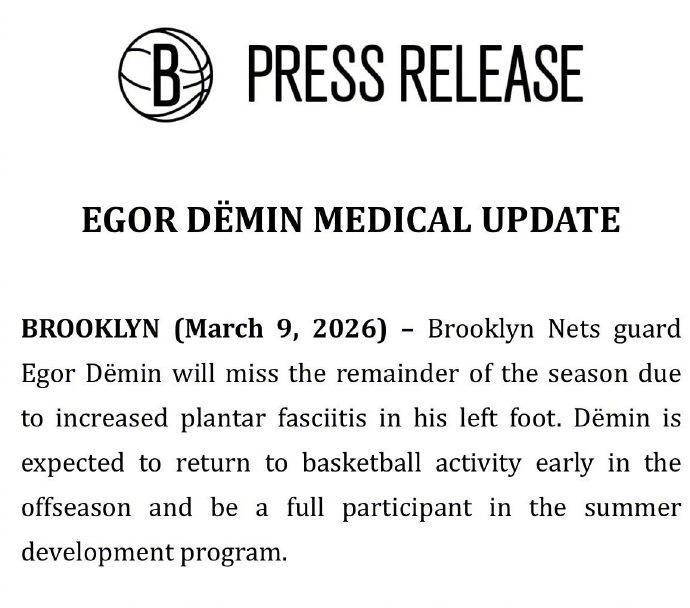 天天盈球网-篮网官宣:8号秀杰明因伤赛季报销 曾连34场命中三分新秀历史第一